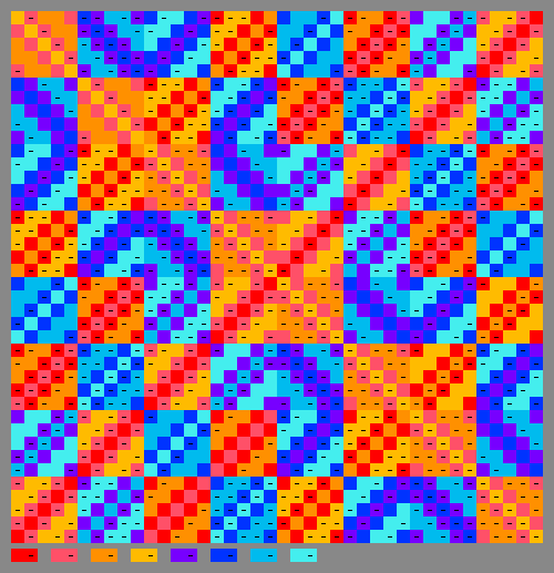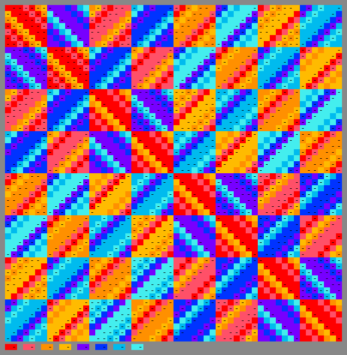 An OD(56;7,7,7,7,7,7,7,7) is a square matrix with 56 mutually orthogonal rows. The entries are from the set {a,-a, b, -b, c, -c, d, -d, e, -e, f, -f, g, -g, h, -h} and each of the 8 variables occurs 7 times per row. Similarly for the other OD's. In the images, the eight variables a,b,c,d,e,f,g,h are represented by different colors (see the key at the bottom of the image). The minus signs indicate where a variable is to be negated.
