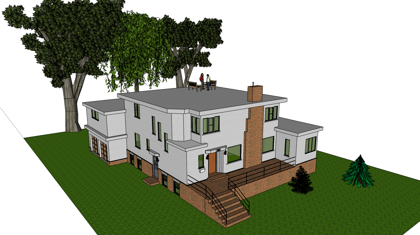 Before you go getting all awe-inspired by the trees in the background, those are not mine. Nor are any of the other trees or anything on the roof. They came from the components library provided. (Well actually you google for the compnents you want from within sketchup.)