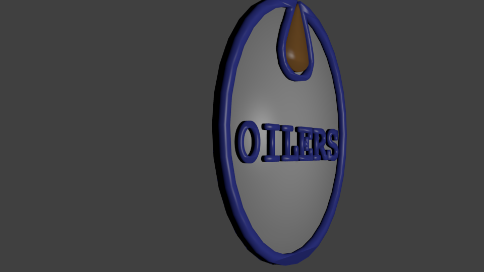 For my project, I decided to go with the Edmonton Oilers logo. I made the model by creating 5 different objects. These objects are the white circle, the orange oil drop, the blue outer circle, the letters, and the back cover of the logo. The objects needed to be placed together in various degrees of thickness by using the extrude function. I also had to create new objects from text in order to manipulate the text in 3D. Once the text were objects, I was able to move the vetrices along the Z-axis in order to match the thickeness of the outer blue circle. The oil drop was created from a circle with the manipulation of the vertices. The back cover is a thin layer to cover the different objects.