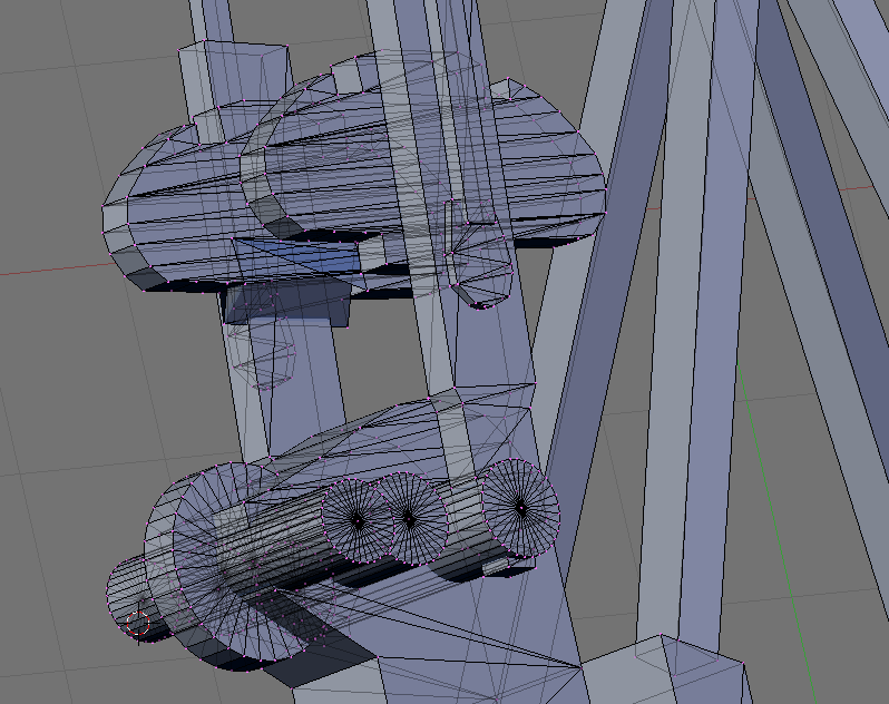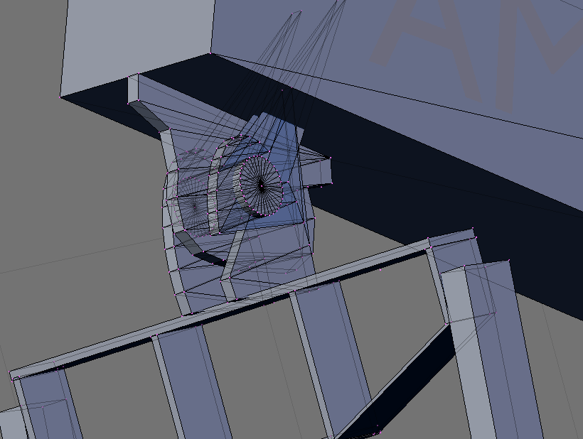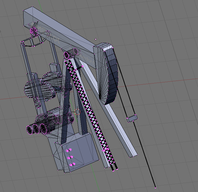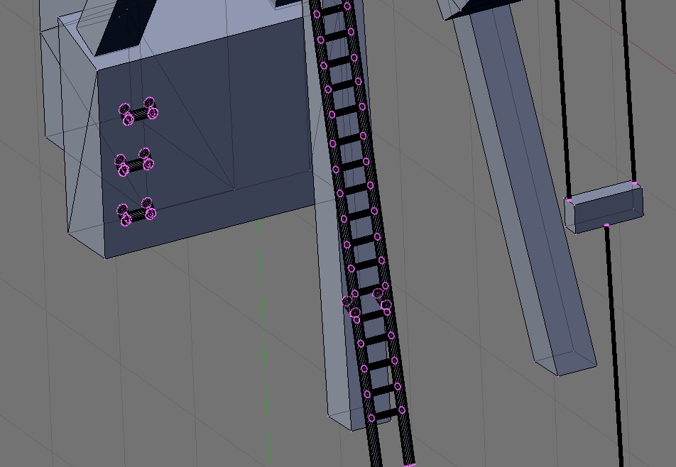 Here is a view of the last three things I modeled: a small ladder in the back, a large ladder near the front, and two cords attached to a weight which is then attached to one cord that goes into the ground